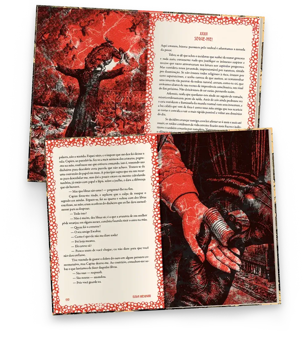 Ao longo do romance, Mesquita mantém a elegância irônica machadiana, mas a deforma deliberadamente com o avanço de um horror cósmico que Bentinho tenta compreender, sem jamais controlar.